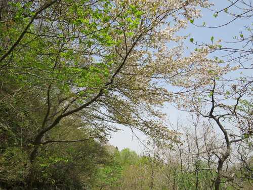 足元にピンクの花びらが落ちているのに気づいて、見上げてみると、ヤマザクラの木がありました。山腹のサクラの花は、4月下旬から5月中旬が見ごろです。