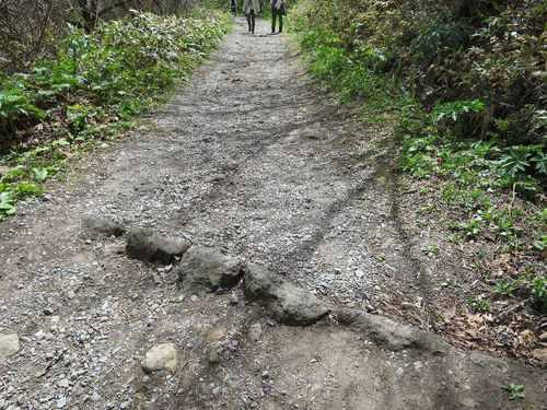 旧登山道は、よく整備されて歩きやすい道ですが、時々現れる段差には注意が必要。これは、山に降った雨を速やかに排水するための、要塞時代からの仕掛けだそうです。