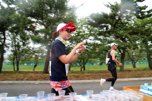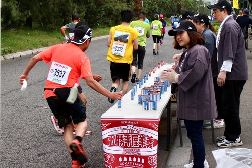 ここからが正念場の30キロすぎ、コカ・コーラも合わせて提供され、ランナーたちの気分転換にぴったりです。