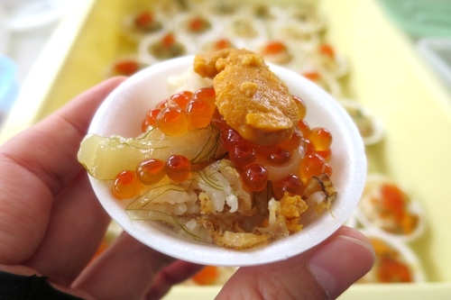 全国ご当地どんぶり選手権入賞の「函館朝市漁り火がごめ丼」をひと口サイズにアレンジ。ふっくりんこのほたてご飯に、がごめ昆布、いかさし、いくら、うにをトッピングした贅沢丼です。地元食材の共演に、ランナーたちの頬もゆるみます。2018年は、さらにミニサイズでカニののった「朝市海鮮丼」も登場する予定。