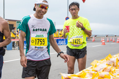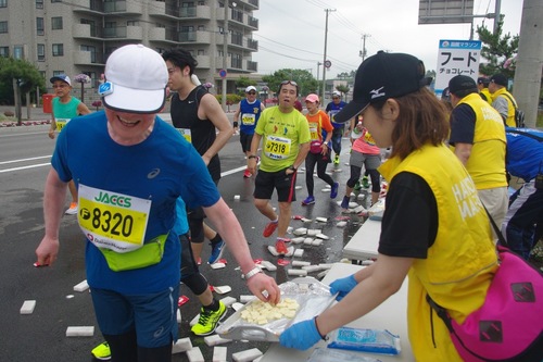 ハーフマラソンのゴールに向かう一団と別れての、フルマラソンの31.3キロ地点、第10エイド(万代ふ頭付近)。後半の難所・ともえ大橋手前のエイドステーションも豪華なラインナップです。