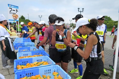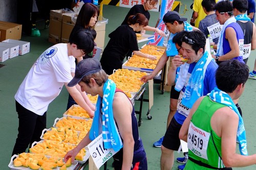 ゴール後のランナーを待っていたのはメロン! ここでは、ハーフマラソン出場のかたへの提供になります(フルランナーには第12エイドで提供)。