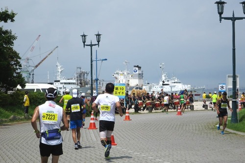 35.8キロ地点の第12エイド、緑の島は函館湾に造成された人工島。2013年に続いて、2018年8月にもGLAYの大規模野外ライブが行われることで話題ですが、函館マラソンでは一大エイドステーションに。ベイエリアから新島橋を渡って島に入ると、海をバックにフードコーナーが見えてきます。