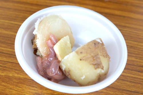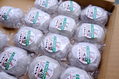 近郊の八雲町産・風の子もちの大福。2018年は、イカめし、じゃがバター、大福のほか、ランチセット(おにぎりとカール・レイモンのソーセージ)、持ち帰り用の米300グラムの、いずれか1つがランナーにふるまわれます。