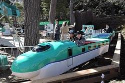 函館公園のミニ遊園地「こどものくに」を走る、北海道新幹線風の「はやぶさ号」。園内にはほかに、観覧車や飛行機などもあり。