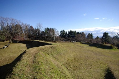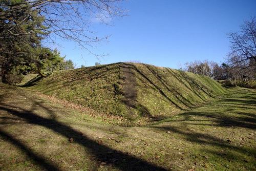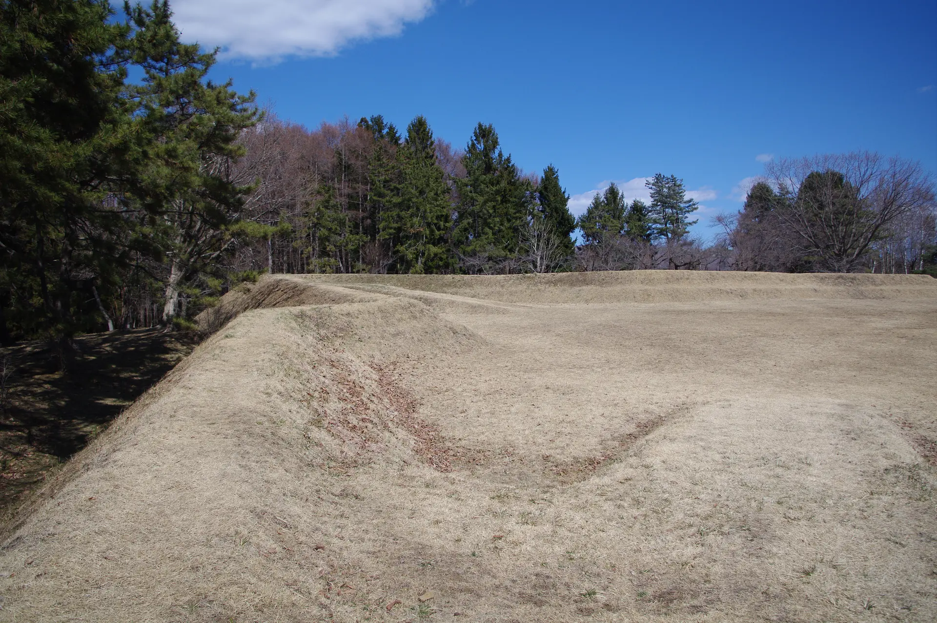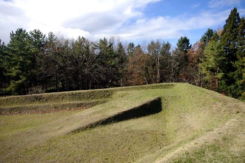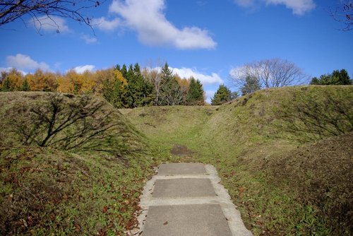 箱館戦争ののちも四稜郭は崩されることなく残され、1934(昭和9)年には国の史跡に指定されました。第二次大戦後の食糧難の折には耕作地に転用されるなどして荒廃したものの、1969(昭和44)年度から1972(昭和47)年度にかけて土塁などが復元され、現在では市民の憩いの場として開放されています(写真は、中の様子を見えなくするための入口の土塁「見隠塁(みかくしるい)」)。