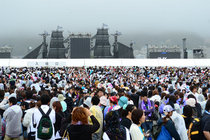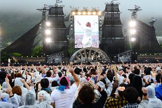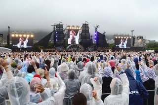 (左)恒例のタオルパフォーマンスは壮観 (右)GLAYの野外ライブで初めてという「雨」をものともせず、熱いステージと客席