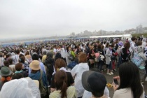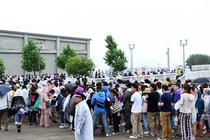(左)列が進むと、前方に海がちらちら (中)入場ゲートの向こうには黒船が (右)ブロックごとに仕切られ、好きな位置に陣取ります