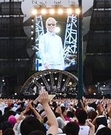 会場の緑の島は、港に浮かぶ人工島。周りを海に囲まれ、函館どつく(造船所)や赤レンガ倉庫などが手が届きそうな近さにあります。メンバーの姿をとらえる巨大モニターに、時々ステージから見える客席が映し出されますが、25000人の後ろに海が広がる光景は、函館の野外ライブならではの絶景でしょう。