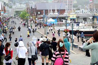 ライブ会場の緑の島は、函館の西部地区(函館山のふもと)にあります。JR函館駅からは市電で10分ほどの大町電停が最寄りですが、人気の観光スポットである赤レンガ倉庫を通るルートを歩いても約30分。ライブ当日は、函館駅から朝市を抜けて、ベイエリアを歩く人の列が絶えませんでした。