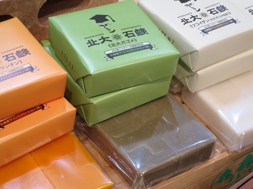 「北大石鹸《北大ガゴメ》(42グラム×2個 1200円+税)」は、「北大ガゴメ」をそのまま高配合。防腐剤、保存料、着色料、香料無添加のオーガニック石けんで、海洋ミネラルと天然保水ジェルの働きで、しっとりした洗いごこちが実感できます。