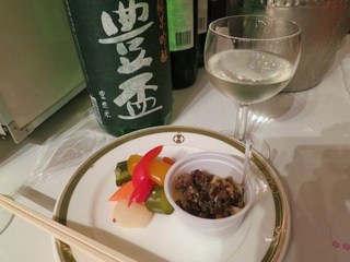 私が選んだのは、地場フレンチのエヴィエ。カモの砂肝のコンフィと自家製野菜のピクルス+弘前の純米酒・豊盃(ほうはい)。