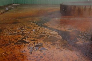 (右)湯船からあふれ出る湯によって、描き出された模様(西ききょう温泉)