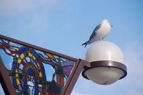 (中)松倉川ぞいの、ステンドグラスを配した街灯にたたずむカモメ