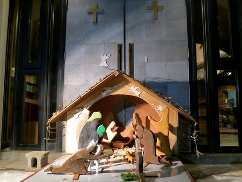 ゴシック様式の聖堂の祭壇前には、キリスト生誕場面を表した「クリブ」が置かれ、アーチ状になったブルーの天井の下、華やいだ雰囲気に。オルガンに合わせて参列者が歌う聖歌が、聖堂に美しく響いていました。