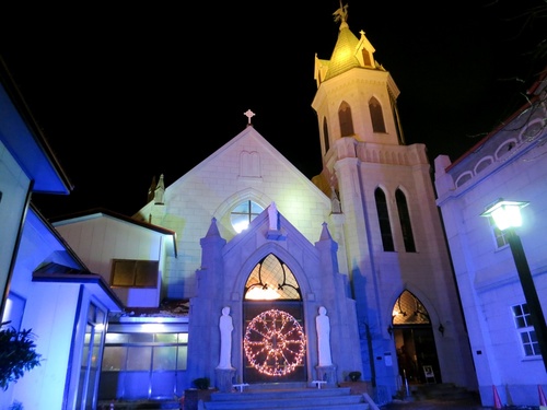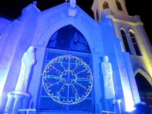 大鐘楼の雄鶏が目印の、ローマカトリックの教会。聖堂正面の扉には、リース型の美しいイルミネーション。ブルーのライトアップとともに、幻想的なムードを醸し出しています。