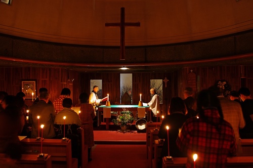 上から見ると十字架の形になっている屋根が印象的な、英国聖公会の教会。外階段に置かれたろうそくの灯りに導かれ、聖堂へ。