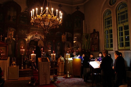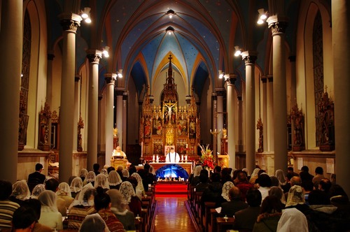 「ガンガン寺」の愛称の由来である特徴的な鐘の音が鳴り響く中、聖祭が始まりました。司祭の祈りの言葉と、混声聖歌隊による無伴奏の聖歌が、神聖な空間を作り出していきます。聖堂内に焚き込められたお香、シャンデリアと赤・白のろうそくによる照明もドラマチックです。