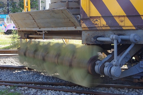 ササラ電車の心臓部とも言える「ブルーム軸」は、車内に設置されたモーターからチェーンを介して回転させます。回転数は専用のコントローラーで制御、上げ下げは車内のハンドルを使って手動で行い、軌道面に接地する面積を変えることで、レールの溝に溜まった雪も含めて除雪することができるのです。