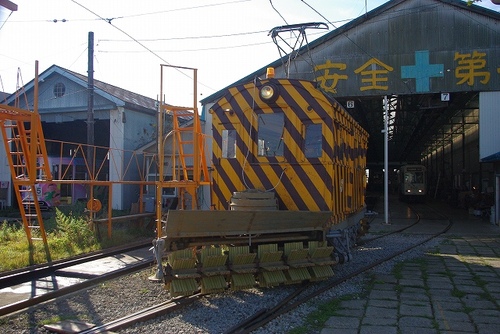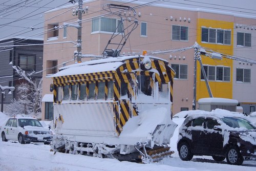 ササラ電車が除雪に活躍するのは、大雪の早朝か深夜で、函館市民でもそうそうお目にかかることはありません。除雪に出動していないかぎりは駒場車庫で待機しているので、駒場車庫前の歩道から見ることができるかもしれません。