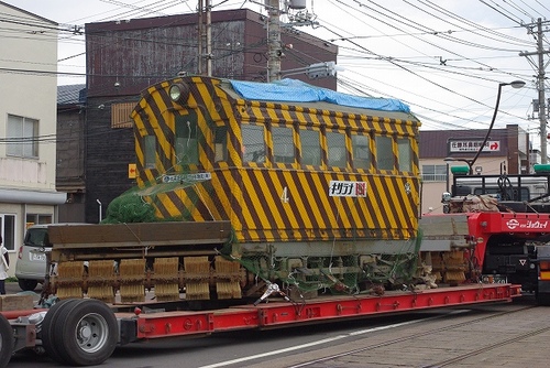 現在活躍中のササラ電車は、1903~1906年(明治36~39年)に製造された車両をもとにした「ヨヘロ型」という東京市電(現在の東京都電)の車両がルーツ。現存するもっとも古い都電車両ということになります。排4号の天井には、1917年(大正6年)の車体新造時に張りつけられた柄つきの壁紙が、100年以上たった今も残されています。この排4号は、2011年に東京の江戸東京博物館で開かれた「都営交通100周年記念特別展」に合わせ、およそ76年ぶりに東京への里帰りを果たしました。函館を発つ際は、大型クレーンで丸ごと吊り上げて大型トレーラーに載せられ、苫小牧港で船に積み込んで川崎港へ、川崎港から両国まで陸送。事前にレールを敷設しておいた展示場所へはフォークリフトで搬入したそうです。