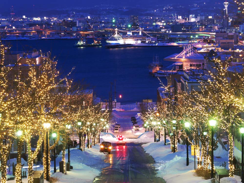 函館山のふもとの八幡坂、開港通りが、合計約16万個の電球によるきらびやかなイルミネーションで輝きます。