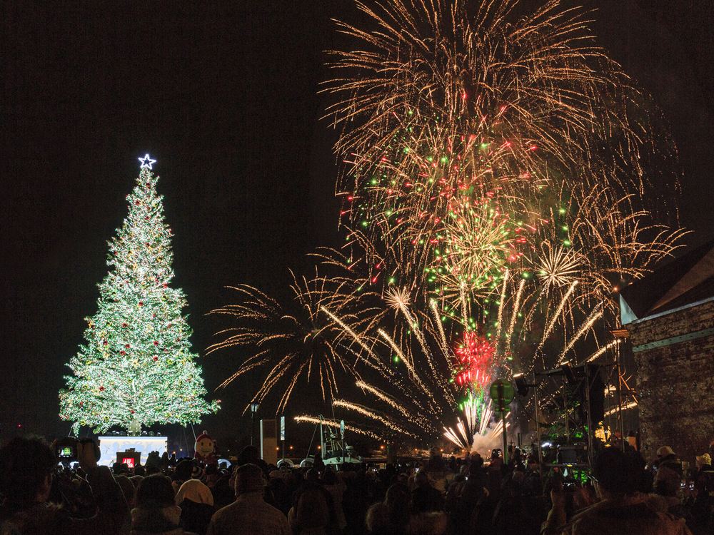 場所はショッピングモールのある赤レンガ倉庫の目の前。毎日ツリー点灯時の18時に、花火が打ち上げられます。
