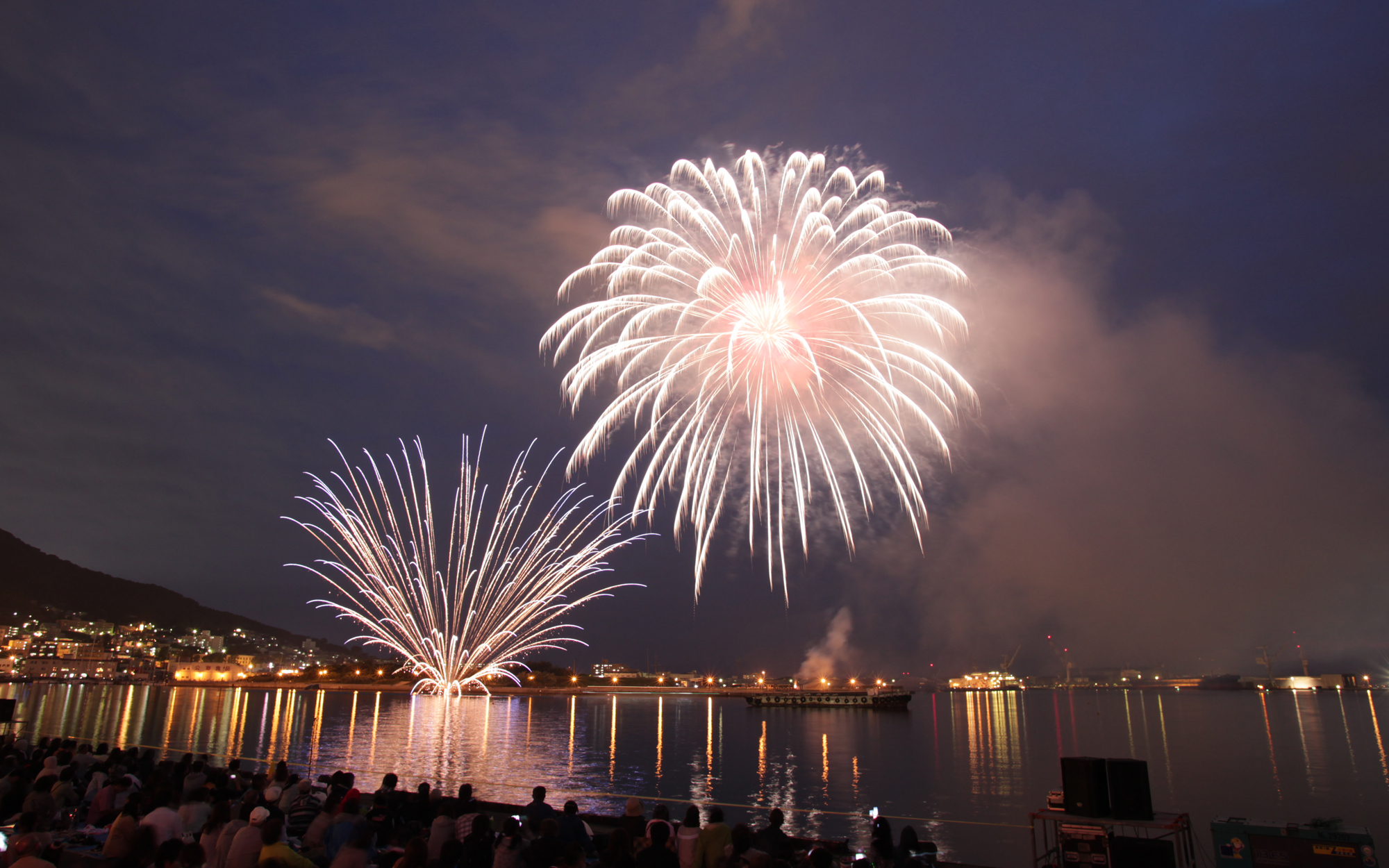 「函館港まつりの初日を飾る花火大会。5部構成(予定)のプログラムで、ワイドスターマインや大玉花火、仕掛け花火などを、音楽に合わせて打ち上げ予定」