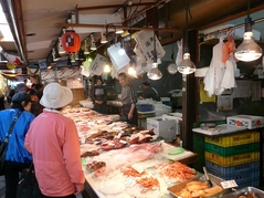 約40の鮮魚店や青果店などが屋内に並び、地元の料理人も仕入れに来るプロの市場。