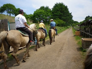 厩舎の前を通って、いよいよスタート。子どもはインストラクターの方に引き馬をしてもらったので、安心してリズムに身をまかせることができます。初乗馬でも、30分も乗ると馬の扱いに慣れてきますので、いろいろな道にチャレンジしてみましょう。