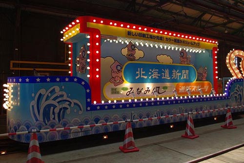 8月初旬の「函館港まつり」に合わせて運行される、函館の夏を彩る花電車。昭和9年の函館大火の教訓を踏まえて内装以外を鋼製に改め、地元の函館船渠(現在の函館どっく)で製造され、「鋼鉄車」の愛称で函館市民に親しまれた300型を、昭和45年に車体の上部構造物を取り払い、装飾を施すなどの大改造を行った車両です。