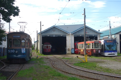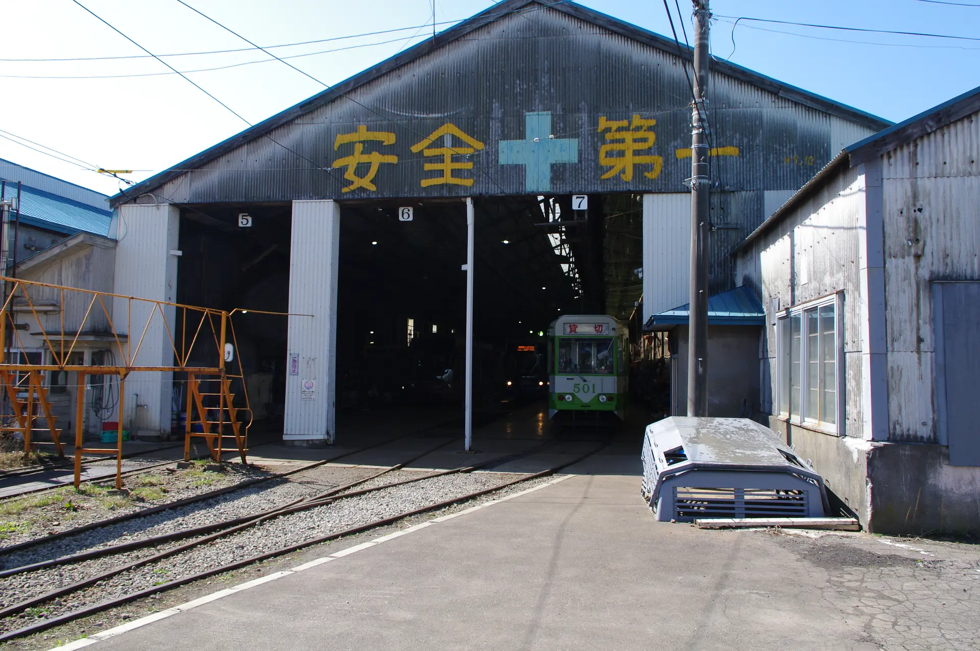 函館を訪れる観光客の皆さんの足であり、絶好の被写体でもある「函館市電」。その運行の中枢である「駒場車庫」は、自動車でいえば駐車場と整備工場の機能を兼ね備えた施設で、函館市電ファンにとっては憧れの聖地といえます。普段は、原則として一般公開は行われていませんが、正面の歩道から外観を眺めることが可能。例年7月に行われる「路面電車感謝祭」では、一般に開放されて敷地内に入ることもできます。それでは、駒場車庫のレポートをお届けしましょう。