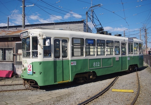 制御方式は違いますが、外観や性能はほぼ同じ。812号は製造当時の函館市電の標準色(通称・笹色ツートン)に復元されています。