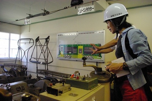 函館市電の乗務員養成はすべて自前で行われています。車庫内には国土交通大臣指定の「電車乗務員養成所」が設けられており、教習所実験室には「模擬運転台」が設置されています。模擬とはいえ、マスターコントローラー(※車で言えばアクセル)やブレーキ弁、圧力計等は実際に使用されていたものがそのまま使われており、台車も実際に使用されていたアメリカ製のブリル21E型。マスコンを回せばモーターとギヤを介して車輪が実際に回り、ブレーキを操作するとブレーキシリンダーが加圧されると同時にブレーキシューが車輪の踏面に押し当てられ、制動がかかります。