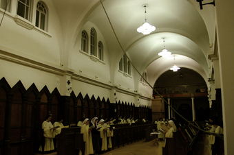 「夜半のミサ」は、静かな鐘の音から始まりました。聖堂の天井から下がる2本のロープを2人の修道女がリズミカルに引き下ろし、鐘を鳴らします。司祭による祈りの言葉、修道女によるグレゴリオ聖歌、聖書の朗読、黙想など、厳かな雰囲気で進行。張り詰めた空気はありますが、想像していたよりずっと柔らかな包み込むような温かさが感じられました。