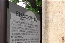 二十間坂を下った先、赤レンガ倉庫群近くにある角錐型の電柱は、大正12(1923)年建造の日本で最も古いコンクリート電柱。今も現役で使われている。
