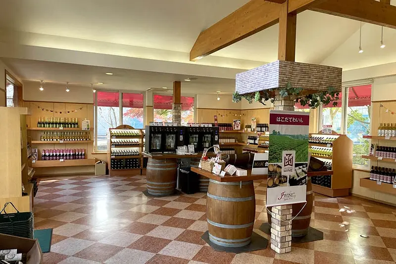 はこだてわいんは、函館市の隣町・七飯町にあるワイン工場。隣接する直営ショップが、はこだてわいん葡萄館本店です。明るく広々とした店内には幅広いラインナップのワインが並び、無料で試飲もできます。直営店限定のものや、七飯町特産のリンゴジュース(数量限定)などもあり、ワインを使ったソフトクリームも人気です。なお、醸造施設の見学は、前日までに電話などでの予約が必要となります。