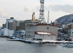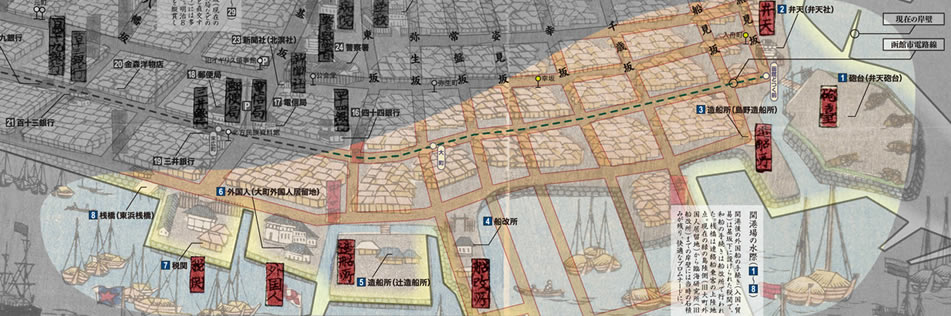 幕末開港後の外国船の入港手続き(入国・貿易)は基坂下に設けられた税関で、和船の手続きは弥生坂下の船改所で行われた。日和坂下の東浜桟橋は、連絡船乗客の上陸地点。弁天砲台からこの3カ所を結ぶ岸壁が明治初期の函館の主要港湾施設であり、現在も緑の島の陸側(旧大町外国人居留地)から臨界研究所(旧船改所)までの岸壁には明治初期の石積みが残り、快適なプロムナードとして整備されている。