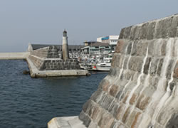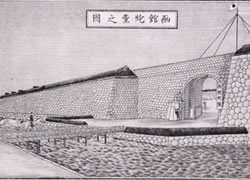 弁天砲台は、ペリー来航と箱館開港を契機に、港湾防備を目的に五稜郭と同時期に着工された。工期7年を要し、元治元(1864)年竣工した。15門の大砲を備え、箱館戦争時は旧幕府脱走軍指揮下の新選組が布陣した。明治29年に取り壊され、跡地は拡張されて現在の函館どつくになった。石垣の石は、同32年に完成した北海道初の近代港湾施設である函館漁港の船入澗防波堤に転用された。同防波堤は、平成25年に大規模な修復工事を実施、往時の姿を復元した。
