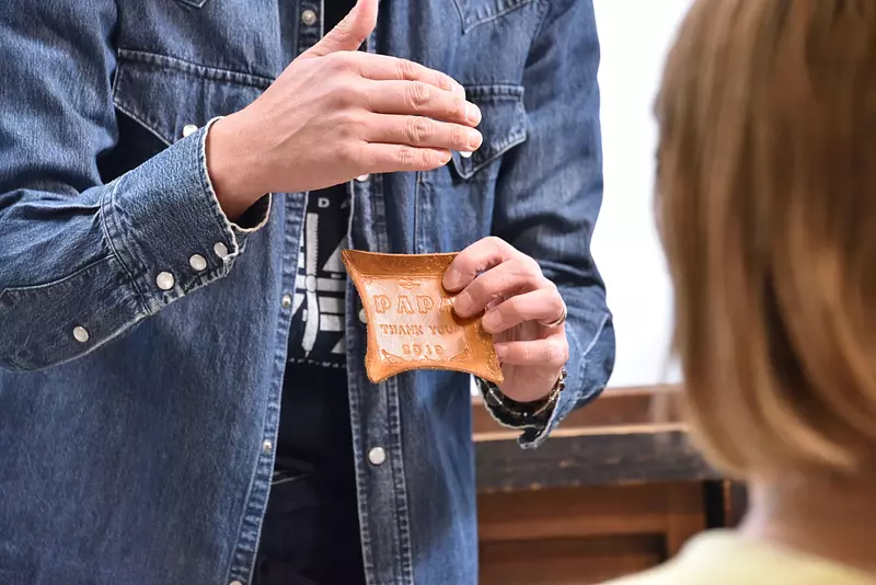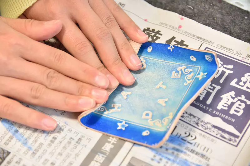 この日は7種類あるレザークラフト体験の中から「アクセサリートレー」制作に挑戦(1870円)。皮の素材に文字や模様を刻印して色を付けるもので、1時間ほどで作ることができます。