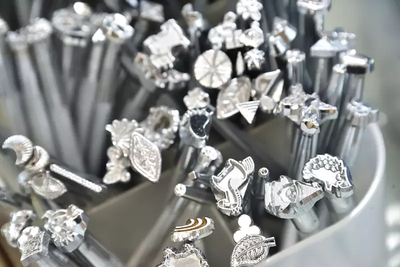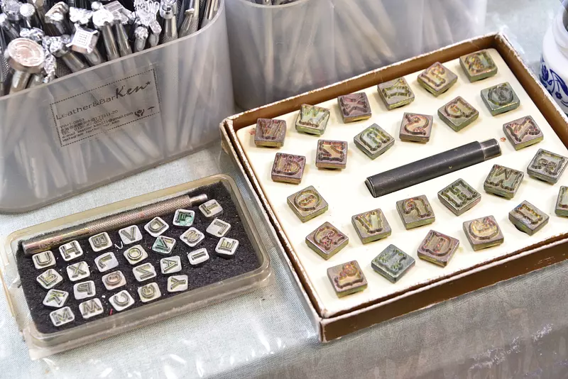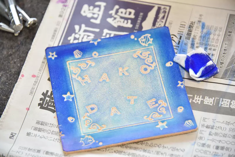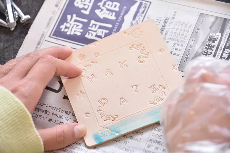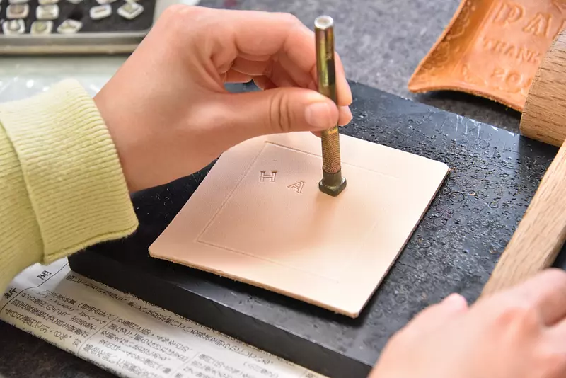 文字の入った棒を木槌でたたいて革に刻印していきます。今回は「HAKODATE」と打ち込むことに。革の真上から、ずれないように5回たたきます。刻印は数字、ローマ字をはじめ、十二支やサンタクロース、雪の結晶など100種類以上!刻印の種類によって打ち方が違うので、千葉さんが丁寧にアドバイスしてくれます。
