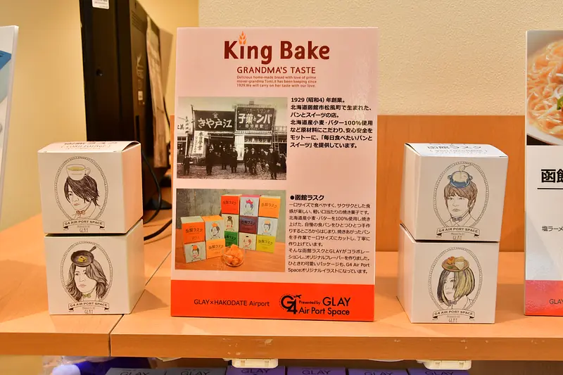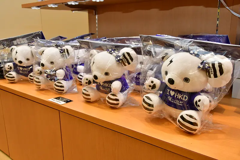 「GLAY×小いけのカレー オリジナルバターチキン」(税込1200円)、メンバーのイラストをデザインした函館ラスク(同900円)など地元企業とコラボレーションしたフードや、「スートライプーくま ぬいぐるみ I♡HKD ver.」(同4200円)など、空港限定オリジナルグッズなどが並んでいます。