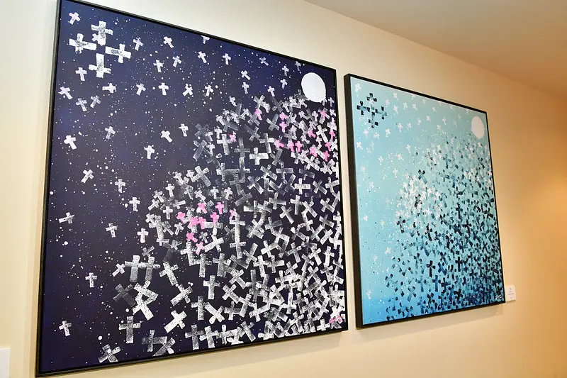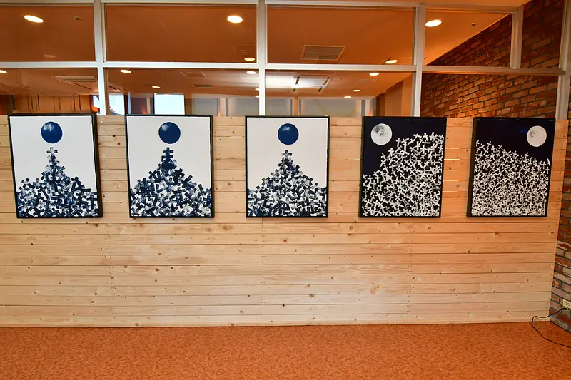 また、同じく国内線ターミナルビル1階の「カフェ美鈴函館空港店」にも、TERUさんが描いた絵画が展示されています。店舗奥のスペースに5枚が並べられており、左から「蒼道(ソウドウ) #1」「蒼道 #2」「蒼道 #3」「左月(サヅキ)」「右月(ウヅキ)」。こちらも函館愛が感じられる作品です。
