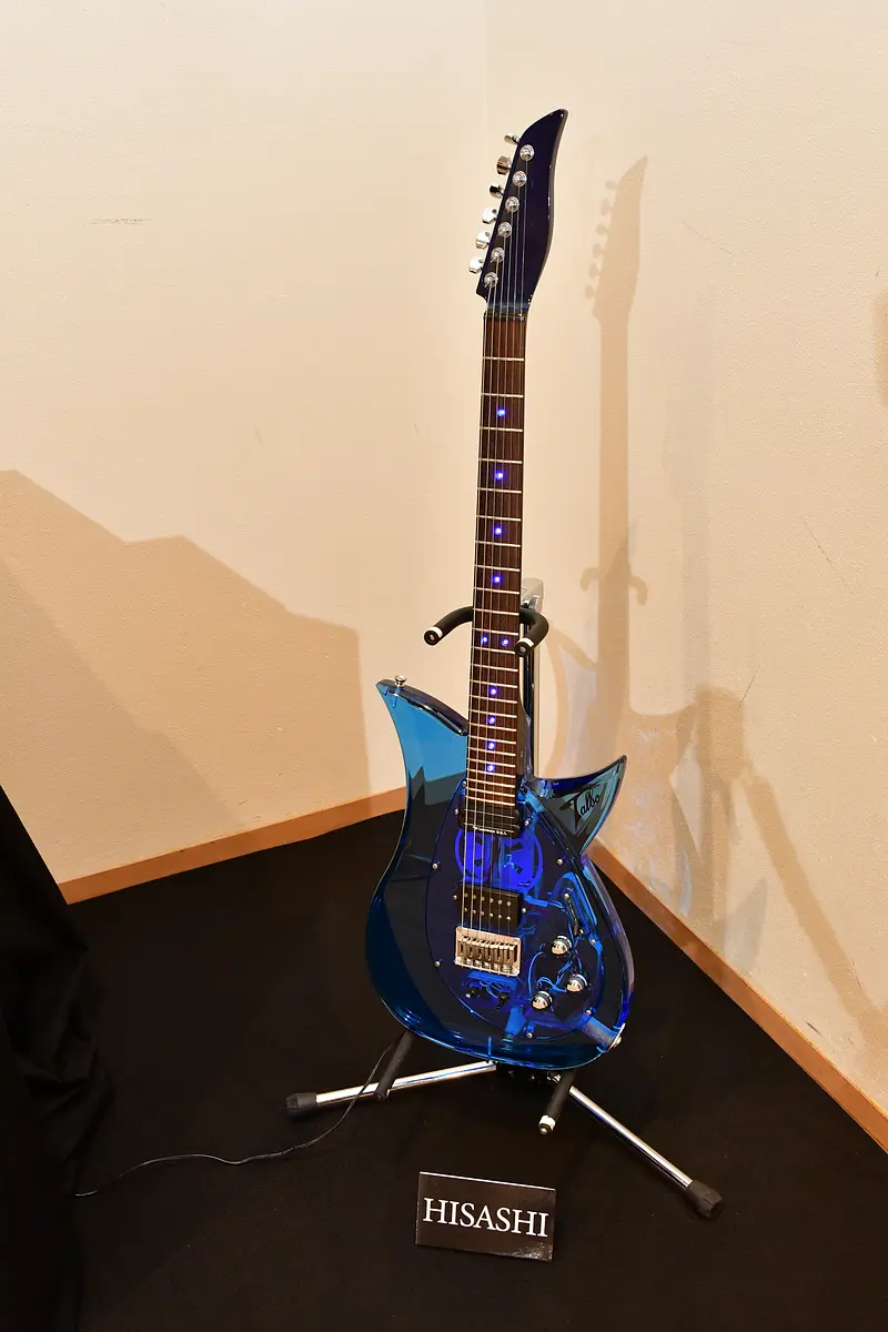 TERUさんが「思い出に残る一番好きな函館の風景」として五稜郭公園の桜や冬の雪をモチーフに描いたという「春夜(シュンヤク)」「白夜(ビャクヤク)」のアクリル画2枚を展示しているほか、HISASHIさん愛用のギターも飾られています。