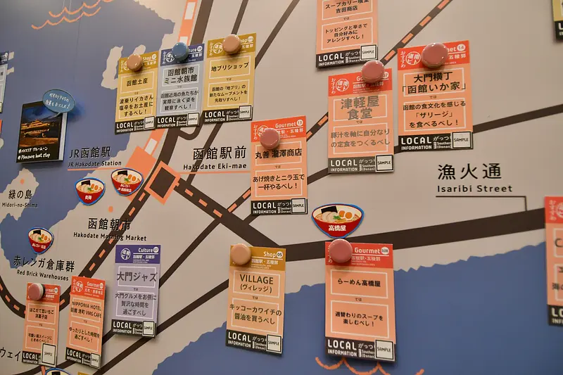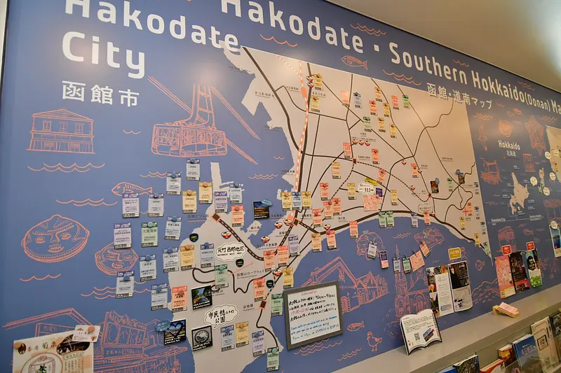 この案内所ではネイチャー、グルメ、カルチャー、ショップの各分野でおすすめを紹介する「道南ビトカード」(計112種類※2023年5月24日時点)が函館市内、道南全域別に壁面のマップに貼り付けられています。案内所スタッフは「GLAYファンの方も、ファン以外の方も、この情報をもとに道南観光の参考にしていただけたら」とPRしています。