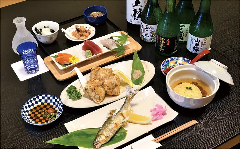 看板料理は店名を冠した爽やかにユズが香る「柚子香まんじゅう」。エビを裏ごししたジャガイモで包み衣を付けて揚げた自家製まんじゅうに、一番ダシを掛けた盛り付けも美しい一品。地物のフグを自らさばいた、白身の程よい弾力も楽しい「ふぐ唐揚」、絶妙な塩加減と火加減で旨味を凝縮させた「アユの塩焼」と熟練の技が冴える料理は、甘口、辛口問わずどの酒をも引き立てる。小鉢3品に刺身、飲み物1杯が付く「晩酌セット」も人気が高い。