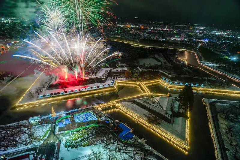 星形が特徴である五稜郭の堀(一周約1.8キロメートル)をイルミネーションで飾り、五稜郭の星型の輪郭を浮かび上がらせます。