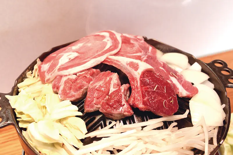 部位ごとに塊肉で仕入れる上質な羊肉は、肩ロースなどの定番からタンといった希少部位まで厚めにカット。4種類の部位が一度に味わえる「大黒セット」のほか、一押しの「ラムチョップ」、厳選したショルダー肉をバジルが香る液体スパイスに漬けこんだ「ハーブ」など単品メニューも多彩に揃える。特注ジンギスカン鍋を炭火で熱して表面温度を均一に整えておき、絶妙な火加減を生み出す七輪炭火で焼き上げる厚切り肉はやわらかくジューシー。鍋の細かな穴から余分な脂が落ちて、増した旨みが後を引く。さっぱりとした口当たりの秘伝のタレを付けて豪快に頬張れば、炊きたての羽釜炊きご飯も進む。