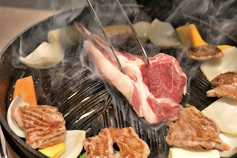 こだわりの炭火で厚切り羊肉を羽釜炊きご飯と楽しむ