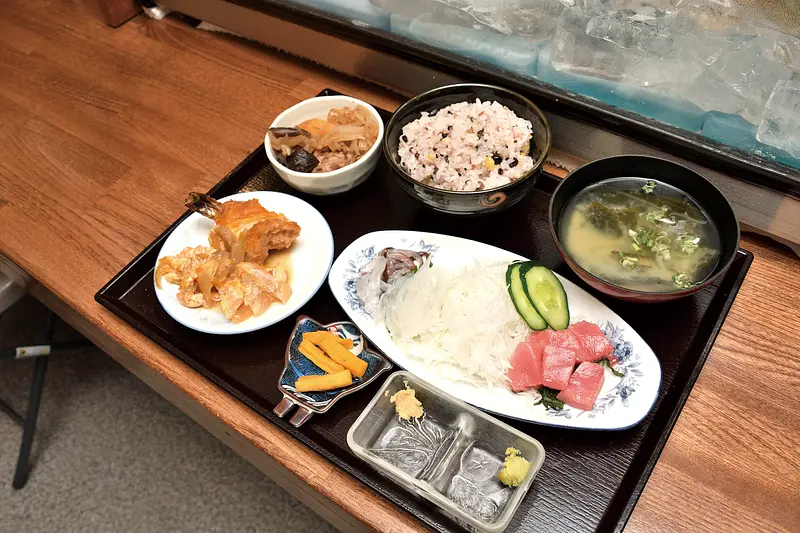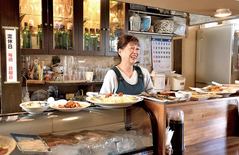 「おばんざい処あっこ」の引き戸を開けると、エビ天の卵とじや肉じゃが、丸干しのサンマ焼きなど、10種類ほどのおばんざいがカウンターにずらりと並ぶ。〝あっこママ〟と呼ばれ親しまれる内川厚子ママが作る料理は、どれも家庭的なあたたかさがあり、日替わりのおばんざいから3品選べる「おばんざい定食」や毎朝仕入れるイカなどの刺身とおばんざい2品の「お刺身定食」を終日提供している。